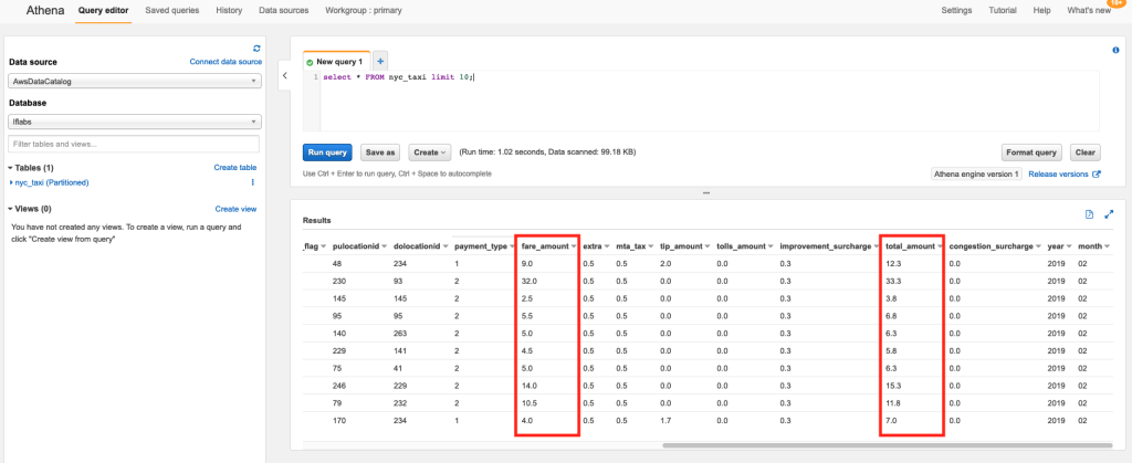 The Athena query results no longer show the “fare_amount” and “total_amount” columns.
