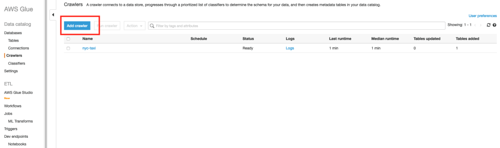 The next step is to create a Glue crawler, crawl the sample data and populate the metadata in the Lake Formation database that we created earlier. Check this documentation https://docs.aws.amazon.com/glue/latest/dg/console-crawlers.html for instructions or follow the step by step instructions in the Glue Console.