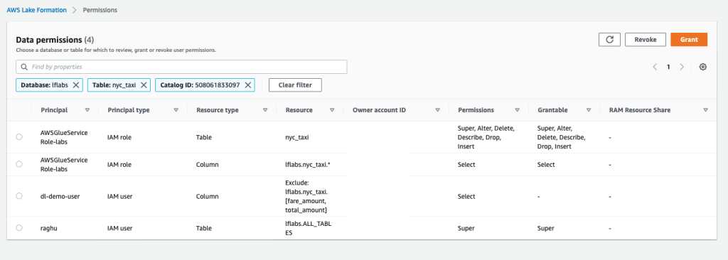 Click on “Data Permissions” from the left menu of the Lake Formation console to view all permissions. You can also use the “Grant” and “Revoke” buttons at the top to manage permissions from this page.